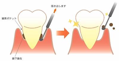 歯周ポケットが深いところには 歯肉の下に毒素の詰まった歯石がついていますので、歯石や細菌を専用の機械で徹底的に除去し根面の汚染物質を取り除いていきます。