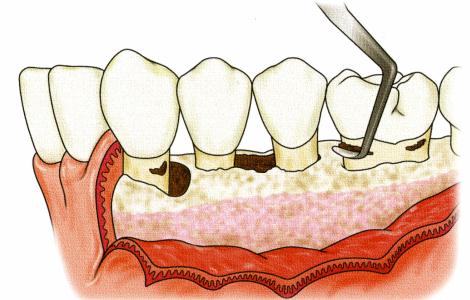 その場合は、歯周外科(フラップ)手術で麻酔下において歯ぐきの一部を「めくって」、見えない部分の歯石を完全に除去します。